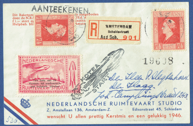 Raketpost 1945. Aangetekend Amsterdam Scheldestraat. Nederlandsche Ruimtevaart Studio.∙ Raketpost 1945. Aangetekend Amsterdam Scheldestraat. Nederlandsche Ruimtevaart Studio.