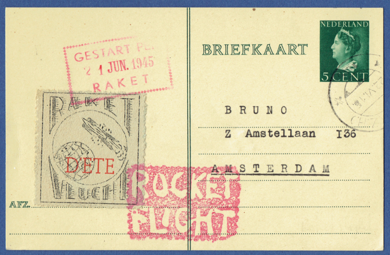 Raketpost 1945. 21 juni 1945. DETE Raketvlucht. Bruno. Op postwaardestuk.∙ Raketpost 1945. 21 juni 1945. DETE Raketvlucht. Bruno. Op postwaardestuk.