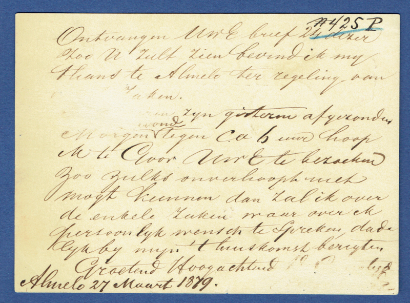 G - Briefkaart met traject takjestempel ALMELO-ENSCHEDE en haltestempel ALMELO naar GOOR.