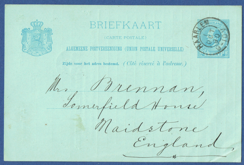 Particulier postwaardestuk HAARLEM. Van Velsen Brothers. Van HAARLEM naar Engeland.