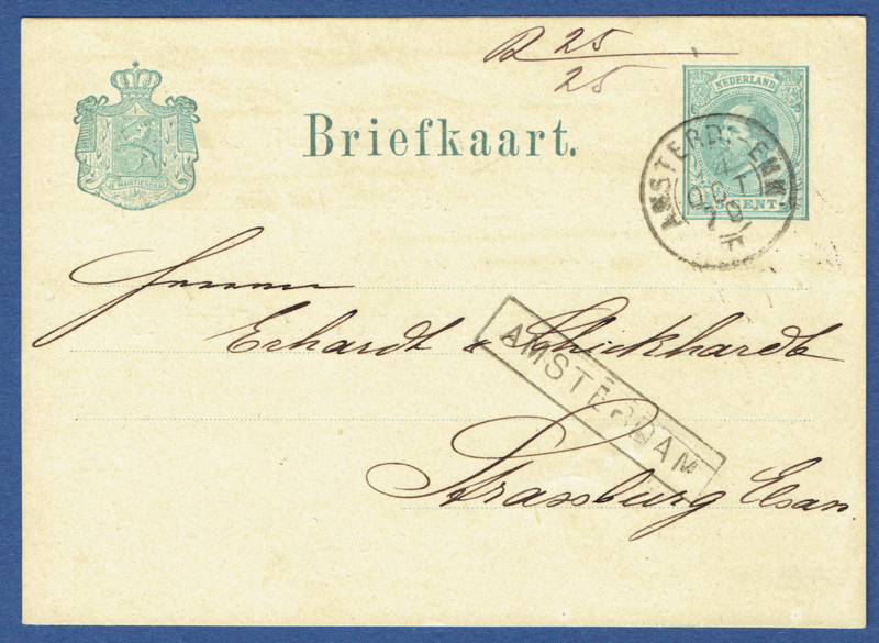 Particulier postwaardestuk AMSTERDAM. Hofmann, Schoffer en Co. Van AMSTERDAM naar Strassburg Els.